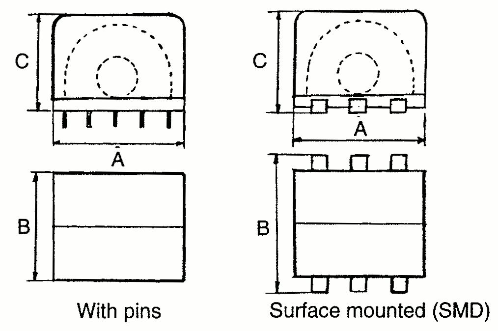 | Type | A | B | C | Type | Pin hole config. | SMD Pad config. |